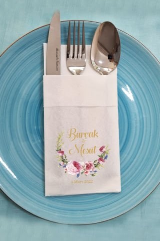 Özel lüks kumaş dokulu cepli peçete üzerine kişiye özel baskı yapılarak üretilmektedir. Ürün fotoğrafında görünen şekilde katlanmış olarak , kullanımıza hazır halde size gönderilmektedir. Ekstra bir katlama vs yapmanıza gerek olmamaktadır. Cep kısmına çatal,kaşık,bıçak yerleştirerek masalarınızda kullanabilirsiniz.
